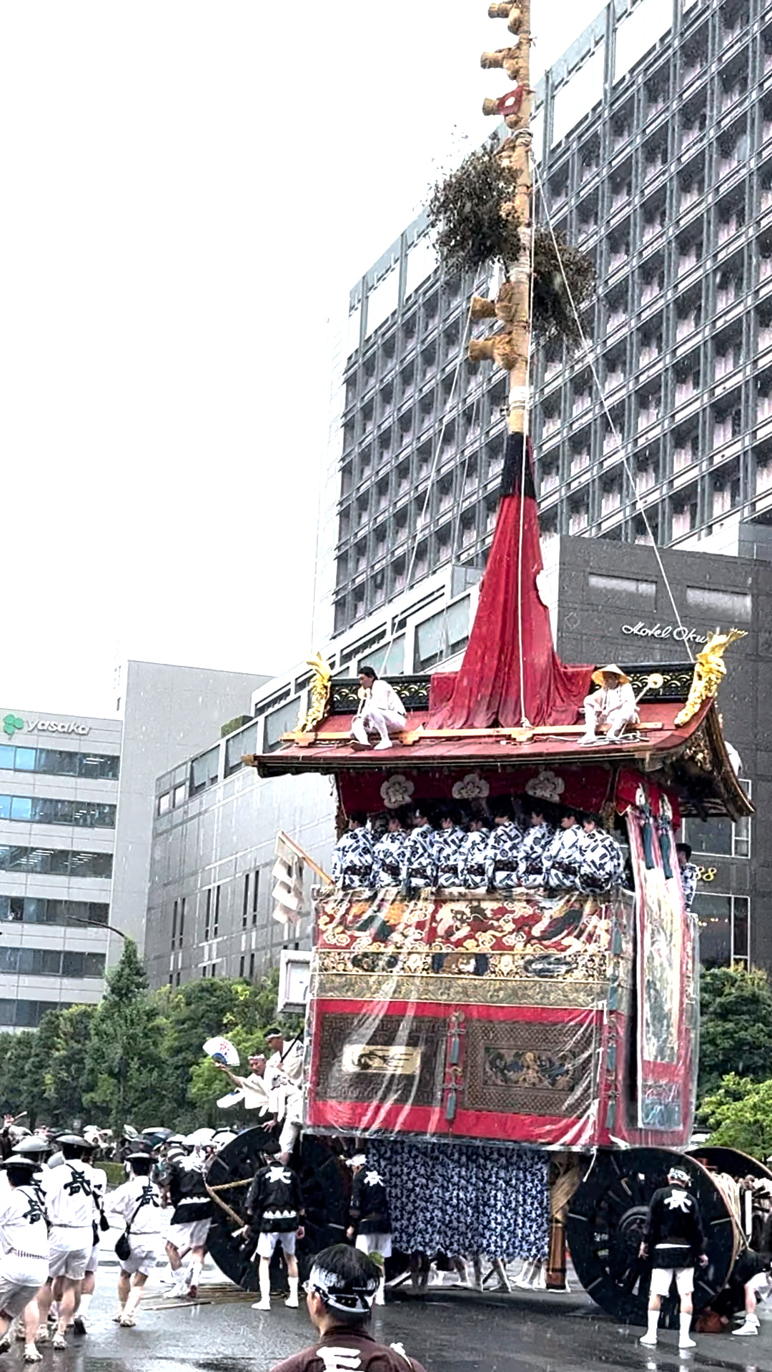 前列にいた北欧から来たという方が、後ろにいる私たちに気づいて傘をたたみ、少し場所を譲ってくれました。そのおかげで、鉾の姿がよく見えました。
